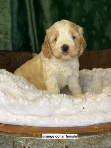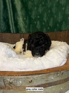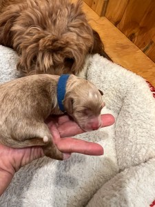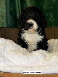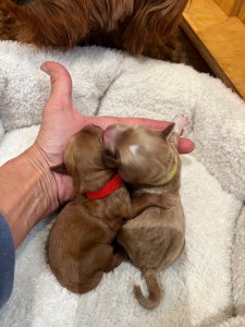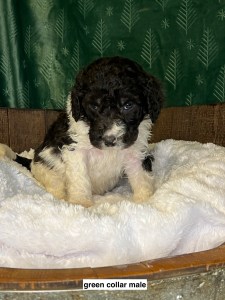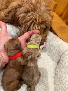 We expect them to be 65-85 pounds, except for the green collar puppy he’s pretty small and we expect will be about 45 pounds. All will have coats that will be wavy or curly.
