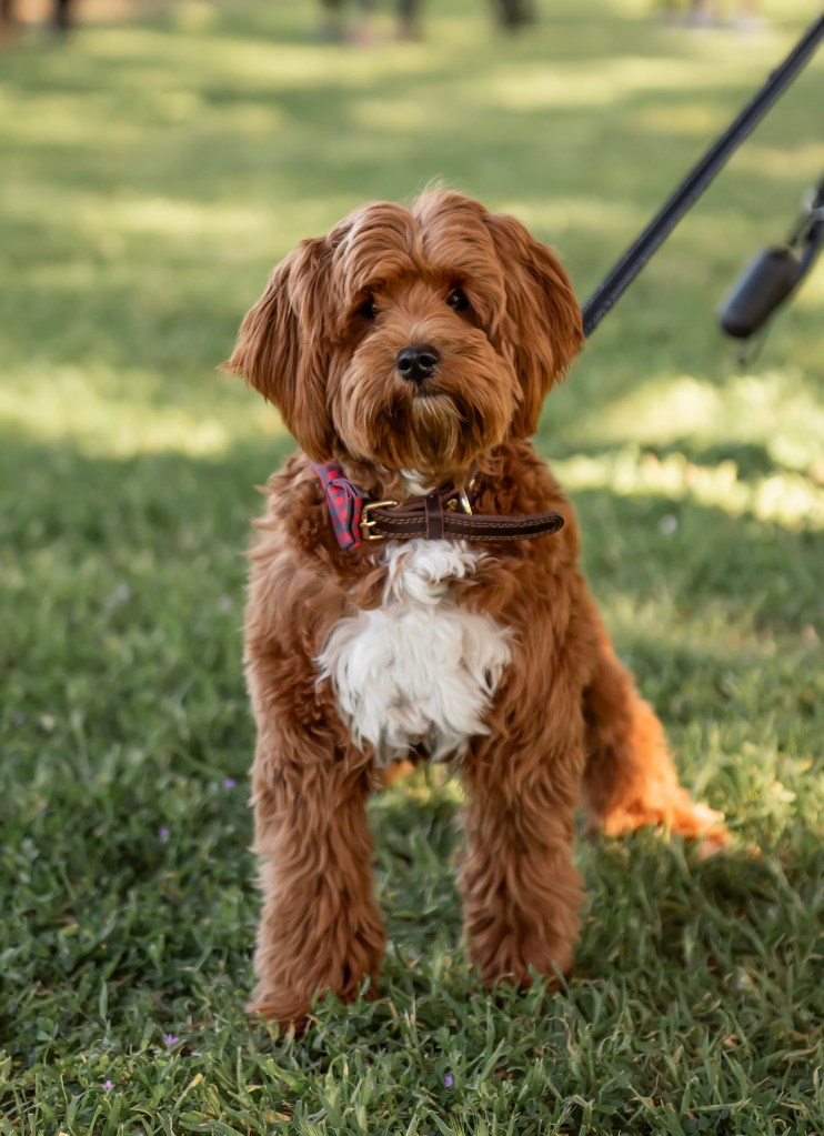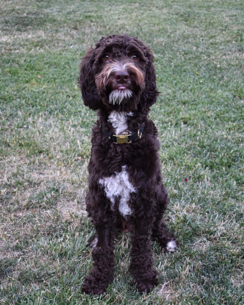 Kokomo is a Medium Chocolate Multigen Labradoodle. His Guardian parents call him “Dume”. His Mom is our Maggie May and his Dad is Gail’s Loveable labradoodles Ryeson. He has a wonderful supersoft deep chocolate coat with abstract markings and a ton of happy personality! His guardians, David and Kenzie of Napa, tell me that they don’t know how they ever lived without him.